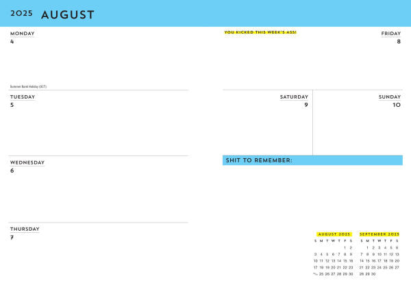 - Monthly and weekly spreads with ample writing space and "sh*t to remember" lists