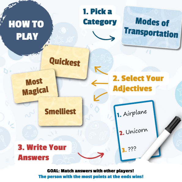 3 of a Kind is a competitive party game of thinking alike, where players try to write matching answers to wild questions. Each round, players select a Category and 3 different Adjectives. Each player writes one answer for each Adjective in the selected Category. The more players who write the same answer as you, the more points you get!
