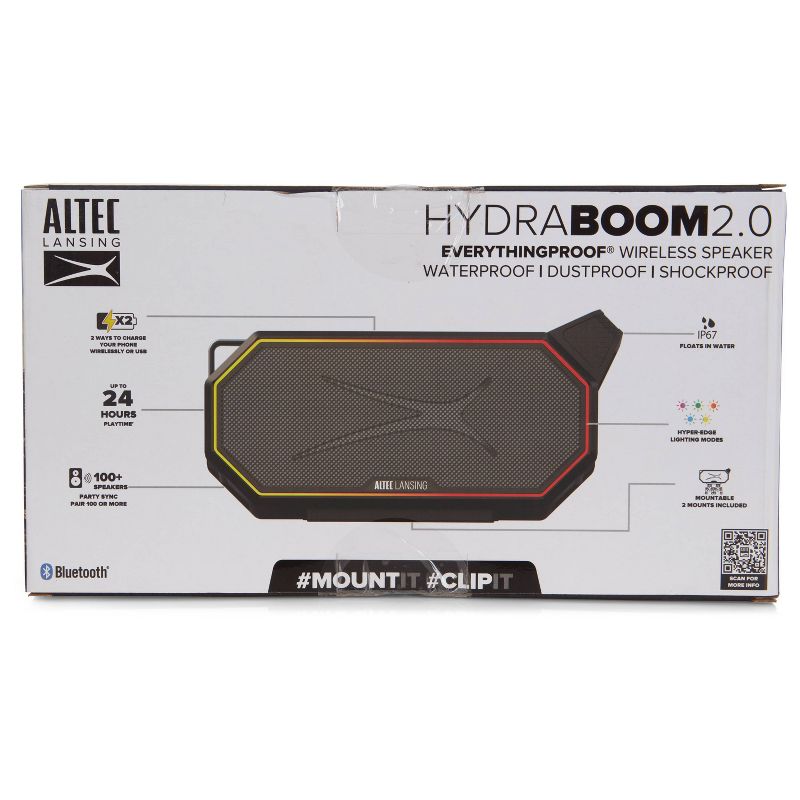 The Altec Lansing HydraBoom 2.0 EverythingProof™ speaker is the perfect party companion. With up to 16 hours of battery life plus built-in HyperEdge LED light modes, the party atmosphere and music will be hard to top! Qi Wireless charging keeps not only your phone but the party alive, simply drop and charge a Qi-compatible device atop the speaker and watch it power up! Don't have a phone with wireless charging - the HydraBoom 2.0 comes equipped with a USB smartphone charger for added functionality. With an IP67 EverythingProof™ rating, built-in speaker mounts, carabiner clip, and carry handle, take the HydraBoom 2.0 anywhere. Party Sync allows you to pair 100+ HydraBooms together for that surround sound excitement. The party just got better with Altec Lansing!