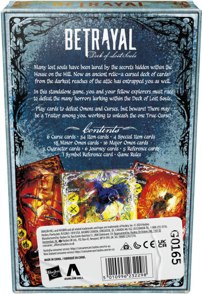 Many lost souls have been lured by the secrets hidden within the House on the Hill. Now an ancient relica cursed deck of cardsfrom the darkest reaches of the attic has entrapped you as well! In the Betrayal Deck of Lost Souls standalone game, a player and their fellow explorers must race to defeat the many horrors lurking within the deck. Play Item cards to defeat Omens and Curses, but beware! There may be a traitor in the group, working against the others to unleash the one true Curse. This strategy game includes premium Tarot card-sized cards: 6 Curse cards, 34 Item cards, 4 Special Item cards, 18 Minor Omen cards, 16 Major Omen cards, 5 Character cards, 6 Journey cards, and 5 Reference cards. Looking for exciting games for game night? Gather friends for this immersive, story-driven card game. With many ways to play, the spine-tingling fun is endless! For 3 to 5 players, ages 12 and up. Betrayal at House on the Hill and Avalon Hill and Hasbro and all related properties are trademarks of Hasbro.