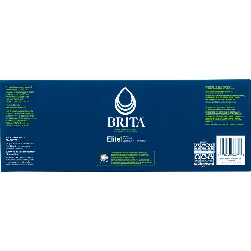 Drink healthier, great-tasting tap water with the BPA-free, large 27-cup Brita UltraMax Elite Water Dispenser. With Advanced Carbon Core Technology, the Elite filter in this water filtration system cuts the taste and odor of chlorine and reduces 30 contaminants, including cadmium, mercury, asbestos, benzene and lead, to deliver great-tasting drinking water. By switching to this Brita water purifier, you can replace 1,800 single-use plastic water bottles a year to stay hydrated, save money and reduce plastic waste. This space-efficient Brita water dispenser is fridge-friendly and features an easy-locking lid and precision-pour spigot. The electronic filter indicator lets you know when it's time for a filter change. Get great taste, less waste and more savings from Brita.Usage Directions: Your water filter pitcher can be ready to use in a few steps. No presoak or rinse required. Wash your hands before touching the filter. Hand wash dispenser, lid and reservoir. Insert the filter into the reservoir. Add cold tap water. Discard first dispenser of filtered water or use to water plants. Replace the water filter every 120 gallons or 6 months. Substances reduced may not be in all users water. Do not use with hot water (85F max).Caution Statements: IMPORTANT NOTICE: Please read the Performance Data Sheet enclosed in the box for complete details. The Brita Filter is not intended to purify water. Do not use with water that is microbiologically unsafe or of unknown quality without adequate disinfection before or after the system. Individuals requiring water of special microbiological purity should follow the advice of their doctor or local health officials regarding the use and consumption of their tap water and Brita filtered water.