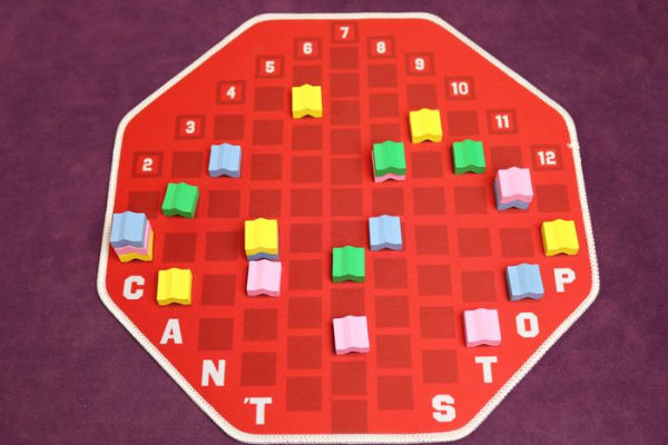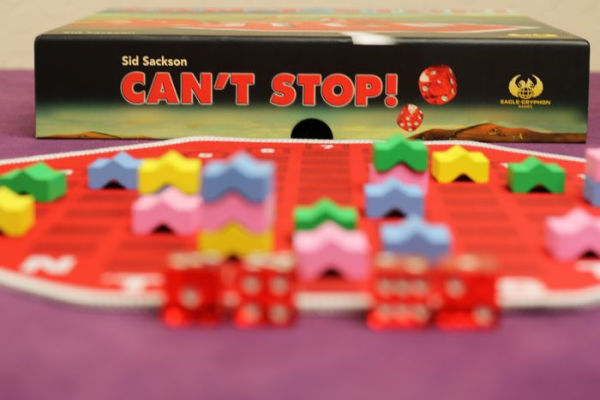 Cant Stop is a press your luck game with 3 simple steps:Roll the 4 dice to make 2 pairsAdvance your markers up the number columns according to your rollsBe the first to make it to the top of 3 columns and you win!Players can keep rolling dice as long as they can advance a marker.If they cant, they lose all of their progress made on that turn!Everyone likes to keep rolling again and again.They cant stop! Can you?This new version of Can't Stop has a Neoprene Mat and Wooden Markers instead of a plastic board and cones.This allows it to have a smaller game box (270mm x 270mm x 50mm)