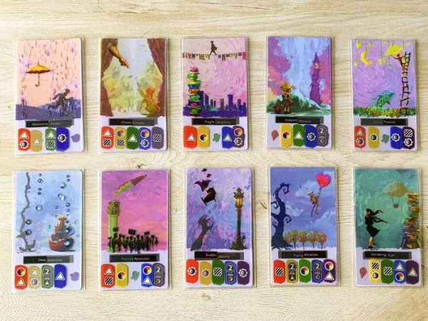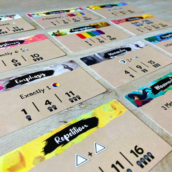 Over the course of the game you will collect transparent Art Cards and layer them to create paintings. Depending on which cards you choose and the order in which you place them, you will reveal or cover icons that trigger various scoring conditions. Each card combination creates a fun, unique illustration and title for your painting. When all players have completed 3 paintings, the game ends.
