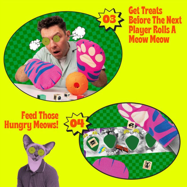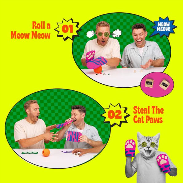 Get ready for the hiss-terically bonkers Cat Mitt Game! Don a pair of oversized cat mitts to feed your kitty-customers, but beware: a fellow feline could roll a Meow Meow (snake eyes) at a whisker’s notice and steal the mitts, so you’ll need to be quick.