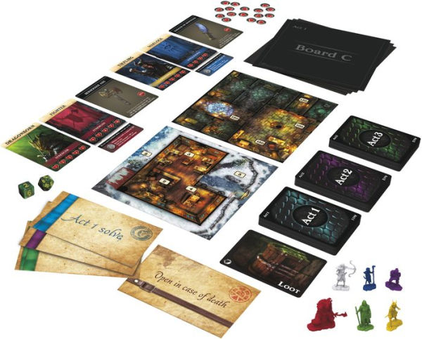 Includes 6 plastic figures, 11 gameboards, 4 secret envelopes, 1 mysterious object, 1 d20 die, 1 d6 die, 298 cards, 43 cardboard tokens, and rules.