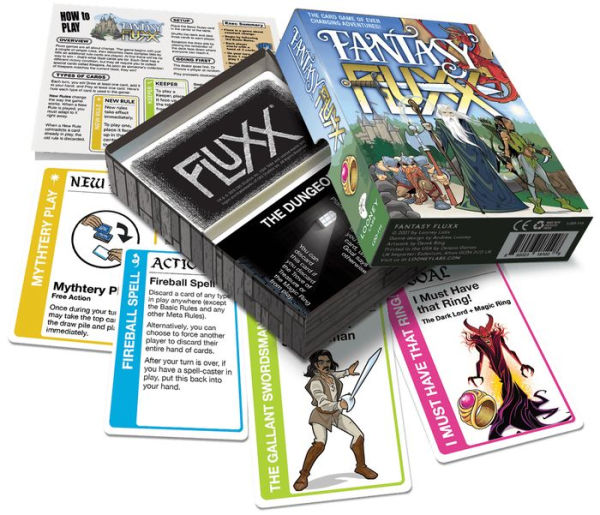 In Fantasy Fluxx, you want to gather your friends for a party - an adventuring party, that is! Pack up your Second Breakfasts, and set off on a classic quest with your faithful companions: the Helpful Elf, the Dwarven Warrior, the Gallant Swordsman, the Wise Old Wizard, and of course, the Humble Young Hero! Learn from the Cranky Magic Teacher how to use your Wand to cast spells like Invisibility or Fireball! You may need them as you encounter the Dreaded Pirate, or when you find out that Captured Princess is actually the Mother of Dragons! Will you and your fantasy favorites survive the Final Showdown with the Dark Lord?