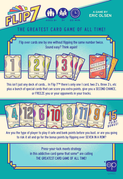 Flip over cards one by one without flipping the same number twice. Sound easy? Think again! This isn't just any deck of cards… In Flip 7™ there's only one 1 card, two 2's, three 3’s, etc. plus a bunch of special cards that can score you extra points, give you a second chance, or freeze you or your opponents in your tracks. Are you the type of player to play it safe and bank points before you bust, or are you going to risk it all and go for the bonus points by flipping over seven in a row? Press your luck meets strategy in this addictive card game that's sure to be the greatest card game you’ve ever played!