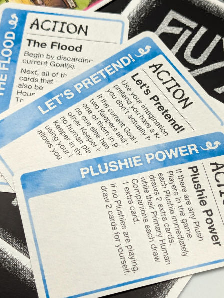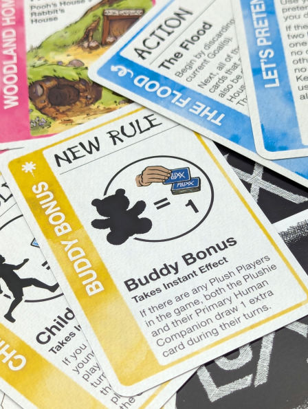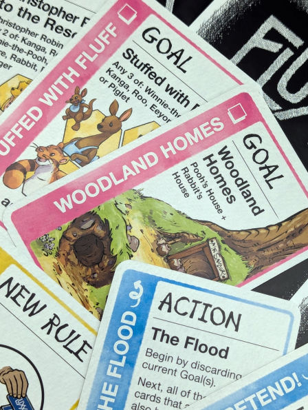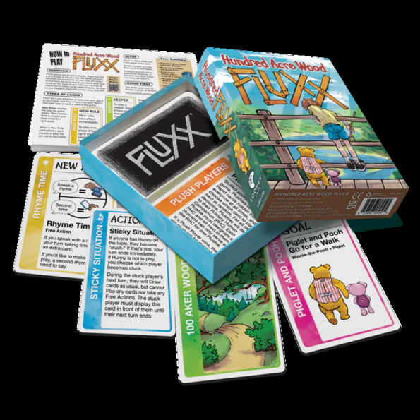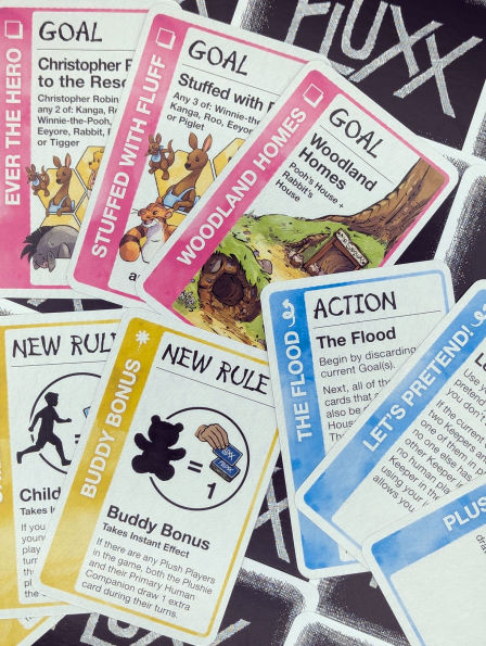 Join Winnie-the-Pooh, Tigger, and the other friends of Christopher Robin as they romp about the Hundred Acre Wood! Will the Bees get suspicious when Winnie floats up on a Balloon? (Yes, of course!) Will Winnie get stuck in Rabbit’s doorway again? (Yes, of course!) Will Eeyore find his tail? (Yes, of course!) Will Piglet catch a Heffalump or a Woozle? (No, you silly old bear, those don’t exist!) And now, for the first time, this version of Fluxx Includes special new rules designed to allow stuffed animal friends to join in the game!