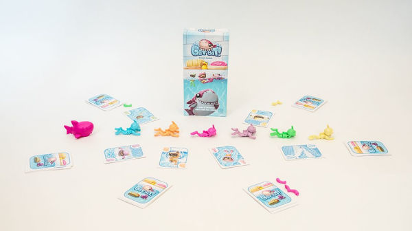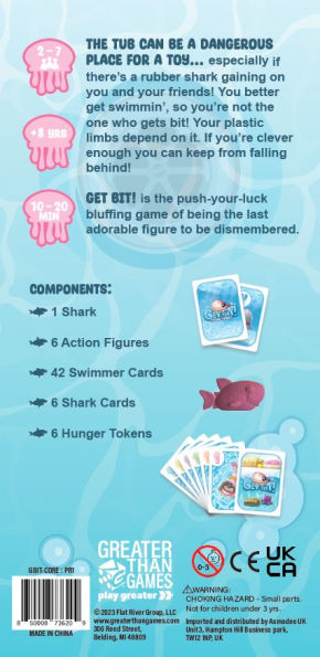 In this numbers based game, you and the other toys thought you were alone in the tub... but that familiar squeaking can only mean one thing: rubber shark! Its time to get swimmin so you dont get bit! Remember: you dont have to swim faster than the shark, you just have to swim faster than your friends!Choose an action figure and collect all the numbered cards of the same color. Choose a card and place it face down. The whole table then reveals their cards. The lowest untied number gets to go to the front of the line and so on until all cards are played. Then, the last one in line gets bit! Your action figure will lose a limb! And once all limbs are lost? You're out of the game. This great game offers playful fun for the whole family!