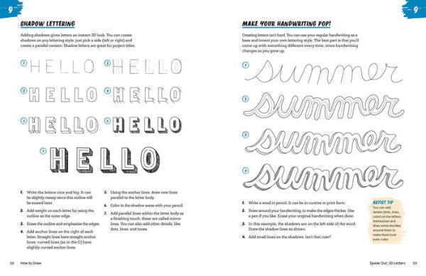 A variety of projects—Get creative with any kids' drawing supplies you have on hand and a variety of projects—including hand lettering, animals, optical illusions, and cartooning.