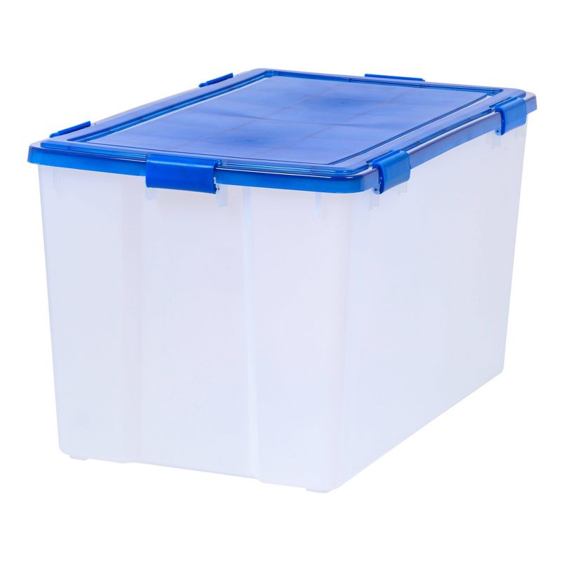 The IRIS 156 Quart WeatherPro Heavy Duty Storage Bins with Lids makes organizing simple and easy. Latching buckles secure the durable body and lid, blocking out moisture, dust, and insects. Grooves on the lid are designed for a stable and secure stacking storage system allowing you to maximize your storage space and creates a customized storage solution. Safely store up to 100 pounds of household goods, craft supplies, gardening supplies, or other items in this handy multi-purpose storage container. These heavy duty plastic Storage Bins with Lids are compatible with IRIS WEATHERPRO Storage Bins with Lids in 6.5, 19, 30, 41, 46, 62, 74 and 156 quarts.