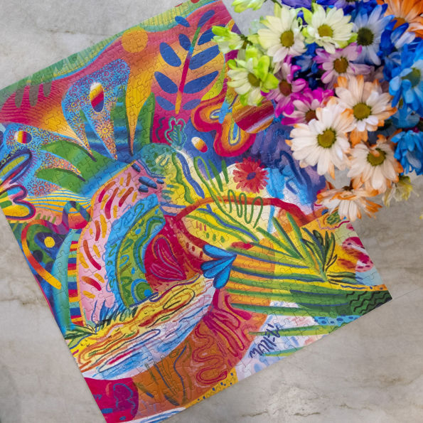 - Artist Mariell Guzman created "Pachanga Familiar," a digital collage consisting of paintings, drawings, and mural designs she has crafted throughout the years. This artwork combines the Mexican slang term "Pachanga" meaning "party" with the lively atmosphere of a large family gathering, to depict a variety of elements blending seamlessly together.- Soft-gloss finished, precision cuts on sturdy cardboard with minimum dust. The finished product is a beautiful 16x20 inch puzzle suitable for standard framing or customization.- Puzzles of Color introduces you to artistic work that captures the mind and delights the soul. It introduces artwork and genius of artists of color Black, Indigenous American, Latin, and Asian heritage.- Family fun and family friendly. This puzzle is sure to ignite family fun, entertainment and memorable family time and conversations.- Art by Mariell Guzman- Puzzle Size: 16x20 in