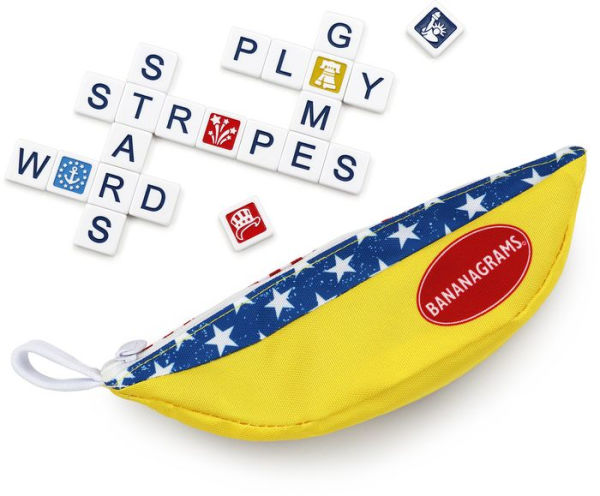 Youll have stars in your eyes over this Patriotic themed version of BANANAGRAMS! The game includes8 special liberty tiles that put a patriotic spin on our Classic BANANAGRAMS word game. As players race to build word grids, they can pick up liberty tiles and use them as stand-ins for any letter! Take the liberty to move quickly because the first to use all their tiles wins! With everything needed to play included in the banana pouch, this Stars & Stripes Edition is go-anywhere fun for everyone!