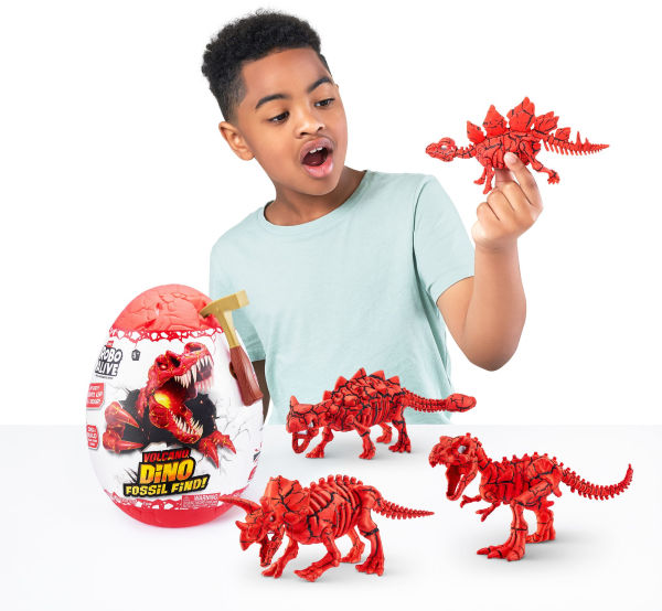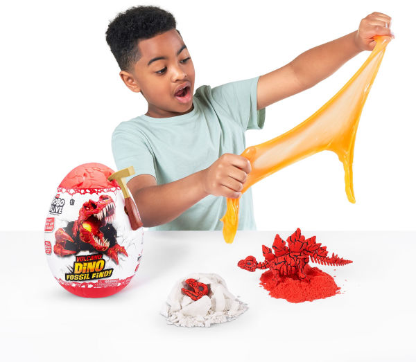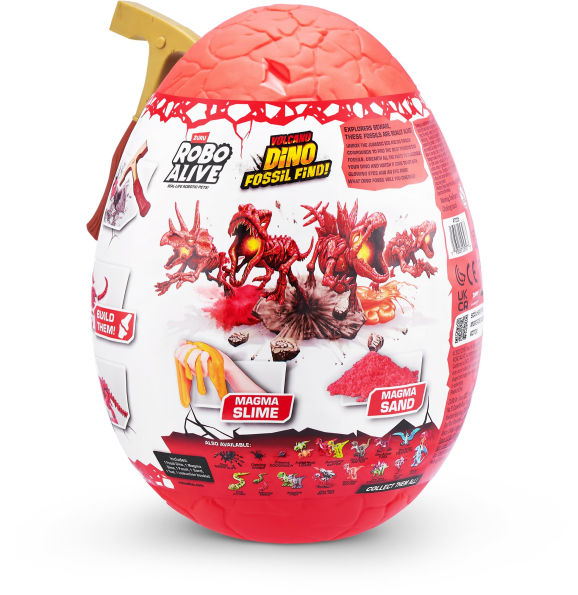 Turn up the heat with Robo Alive Volcano Dino Fossil Find. Dig through volcanic rock, sand, and slime to find the magma dinosaur fossils. Assemble the fossil pieces to bring your dinosaur skeleton to life with lights and sounds! Which prehistoric dinosaur will you find?