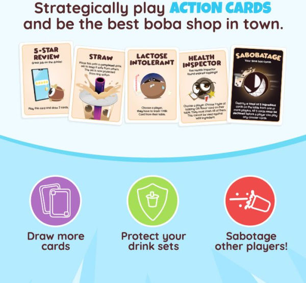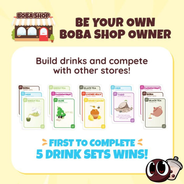 Act as a boba shop owner in this fast paced strategic card game where you're competing to build 5 drinks first while sabotaging your opponents on the way. Create drinks with teas, flavors like fruit and milk, and use extra action from your character topping friends. Action cards will help you in your journey or destroy the other players. Revenge never tasted so sweet.