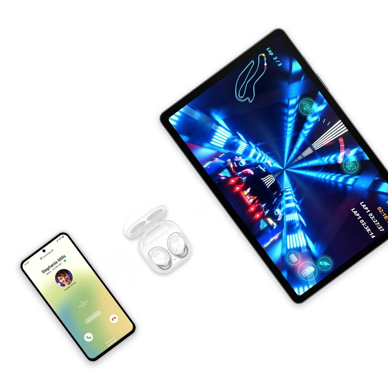 With Auto Switch, Galaxy Buds FE connect to whatever device you are on so you don’t miss a beat. 3 Stream a movie on your Tab and switch to answer a phone call easily through your Buds FE. Once you are done, your Buds connect back to your movie.