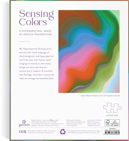 Sensing Colors 1000 Piece Puzzle features an image from Jessica Poundstone's Hyperspectral Sensing art series. The series borrows the language of electromagnetic and hyperspectral (can’t be seen by the human eyes) imaging to remind us of what we cannot see or explain. Feelings, intuitions, visions and vibes are beautiful facts.