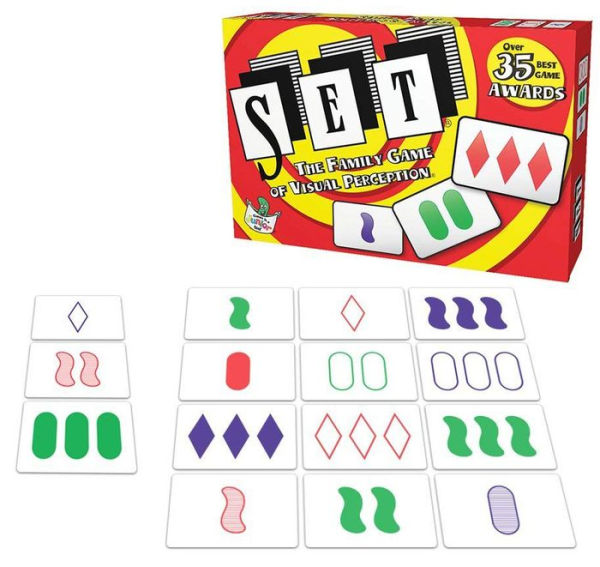 The object of the game is to identify sets of three cards. Each card is unique in its four features: Number (1, 2, or 3), Symbol (diamond, squiggle, or oval), Shading (solid, striped, or hollow), and Color (red, green, or purple). Cards are laid out 12 at a time. The first person who finds a set calls out, Set, identifying the three cards that make up a set. The trick is to find three cards on which each feature by itself is either the same on all of the cards or different on all of the cards. Great for building pattern recognition skills. Includes 81 cards, plastic carrying case, and instructions in English and Spanish. For 1 or more players. A 1991 Mensa Select Award Winner.