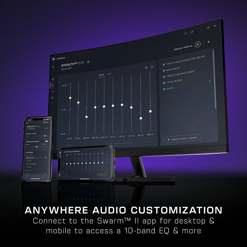 Completely redesigned for the Stealth™ 600, the all-new uni-directional, flip-to-mute microphone features A.I. noise reduction to ensure ultra-clear mic quality with the quietest background possible. Using the Swarm™ II desktop software for PC, or mobile app for iOS & Android devices, adjust noise gate, sensitivity, monitoring levels, and choose from four different mic presets, or even make your own with a custom 10-band microphone EQ. Clear comms are nothing if you can’t hear every vital game detail, so the Stealth™ 600 is packed with the legendary 50mm Nanoclear™ drivers for precise, immersive spatial audio quality. And with the Swarm™ II app, you can cycle through four audio EQ presets, create up to five custom presets with a 10-band EQ, adjust game & chat volume mix, plus activate, or adjust Turtle Beach® exclusive Advanced Superhuman Hearing® sound setting.