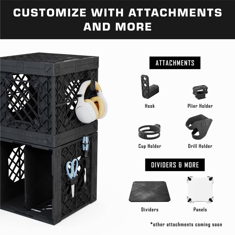 For ages, people of all kinds have been repurposing milk crates in their homes, garages, shops, vans, trucks, and boats as well as on their bikes, ATVs and other rides. We took that crate and we made it modular, collapsible, strong and stackable. We also made it into a system by adding a number of attachments, accessories and sister products to use with it. It helps you store, carry and build.