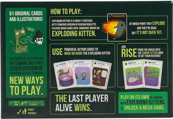 This is not a normal game of Exploding Kittens. There are no Defuse Cards. All the Defuse Cards have been replaced with special Zombie Kitten cards which function like normal Defuses, but with the superpower of bringing dead players back into the game! Dead players can also play cards while dead! This eliminates the biggest problem weve had with Exploding Kittens since it was created in 2015: player death/elimination. Everyone will be in this game until the very end!
